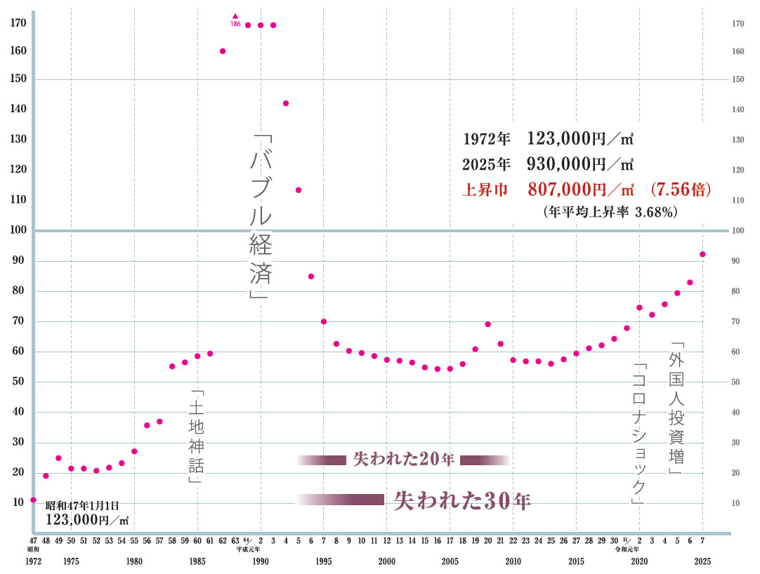 路線価や実勢価格の違いでも分かるように、実態を知ることは難しいのですが、ここでは、公表されている公示価格をグラフにしてみました。